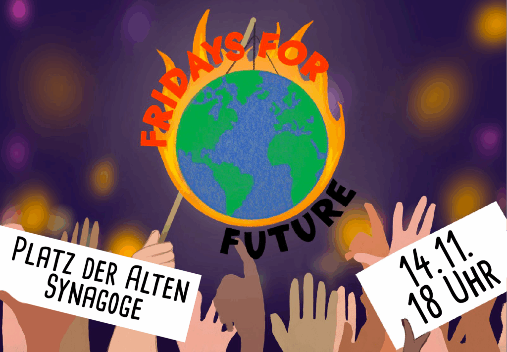 Start ist um 18 Uhr auf dem Platz der Alten Synagoge📍 Öl- und Gaskonzerne, Autolobby, fossile Politiker: Anstatt Menschen vor der Krise zu schützen, profitieren dreckige Konzerne und fossile Politiker*innen global und national von der immer weiter angeheizten Klimakrise. Wir sind wütend, entschlossen und nehmen den Kampf gegen diese Rückschritte auf. Vereint und solidarisch mit Aktivist:innen an der vordersten Front der Klimakrise stehen wir auf. In Deutschland und weltweit gehen wir am 14.11. zum Klimastreik und am 15.11 zur Halbzeit der Klimakonferenz auch vor Ort in Brasilien auf die Straße und machen klar: Die fossile Lobby und ihre Verbündeten sind stark, aber gemeinsam sind wir stärker. Für eine gerechte Zukunft für alle!